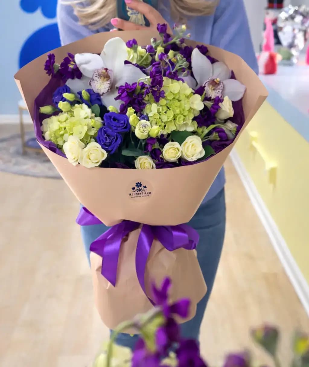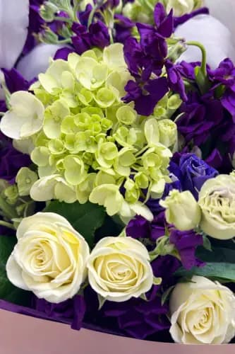 A vibrant and elegant bouquet combining creamy white roses, fresh green hydrangea, rich purple blooms, and delicate white orchids for a striking contrast. Wrapped in soft peach paper and finished with a bold purple ribbon, this arrangement feels joyful, expressive, and refined.