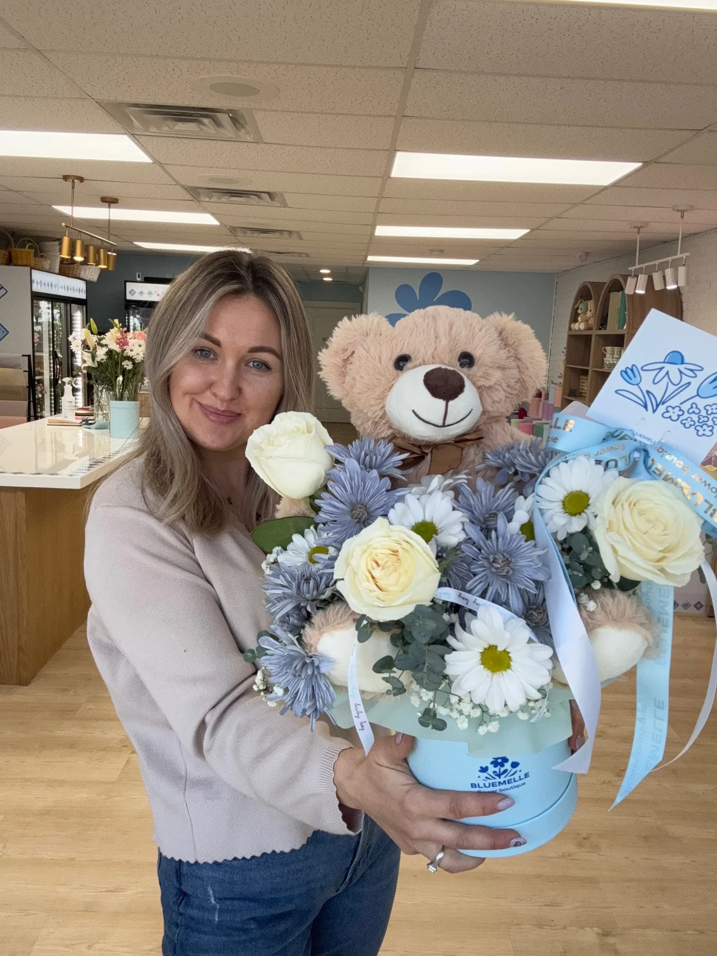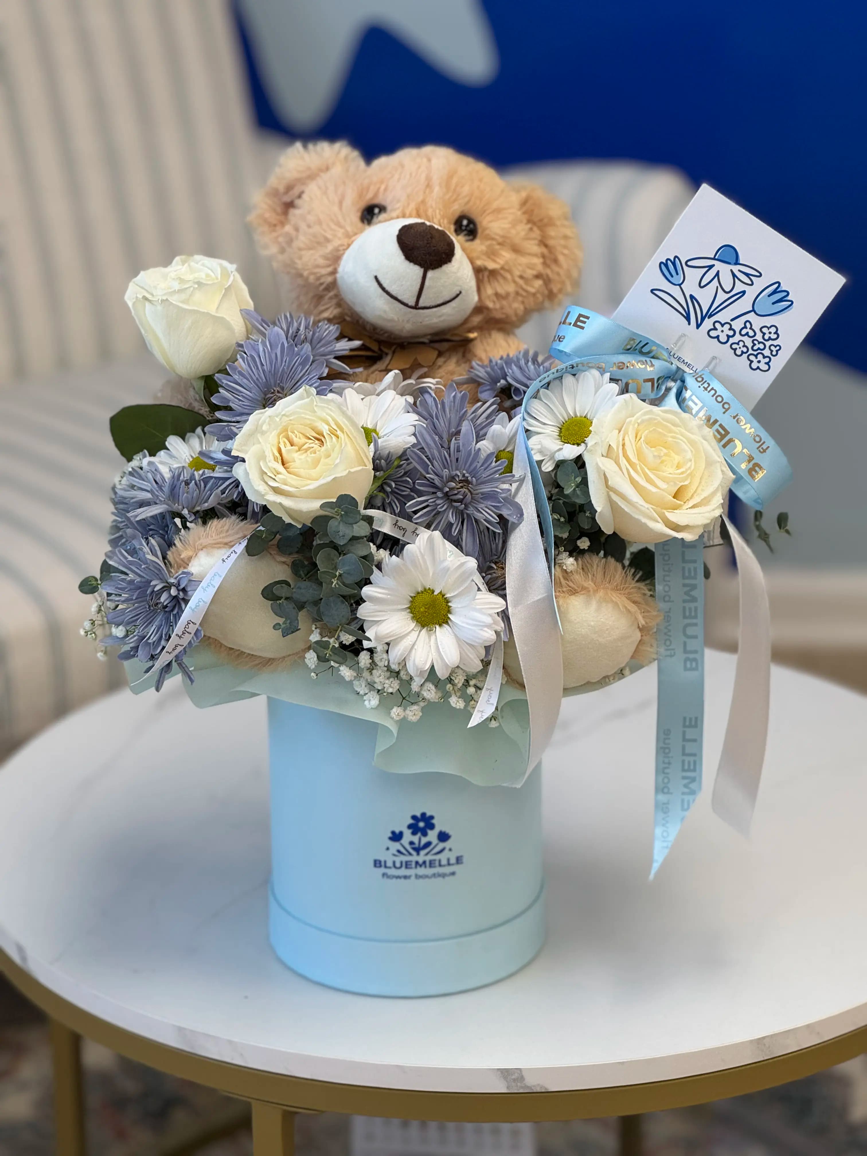 A charming and heart-melting arrangement designed to bring comfort and smiles. Soft blue hydrangeas, blush pink garden roses, and crisp white gerberas create a gentle, soothing palette, while a cuddly teddy bear adds a playful, affectionate touch. Finished with delicate blue ribbons and presented in a classic white hat box, this design feels warm, thoughtful, and full of love.