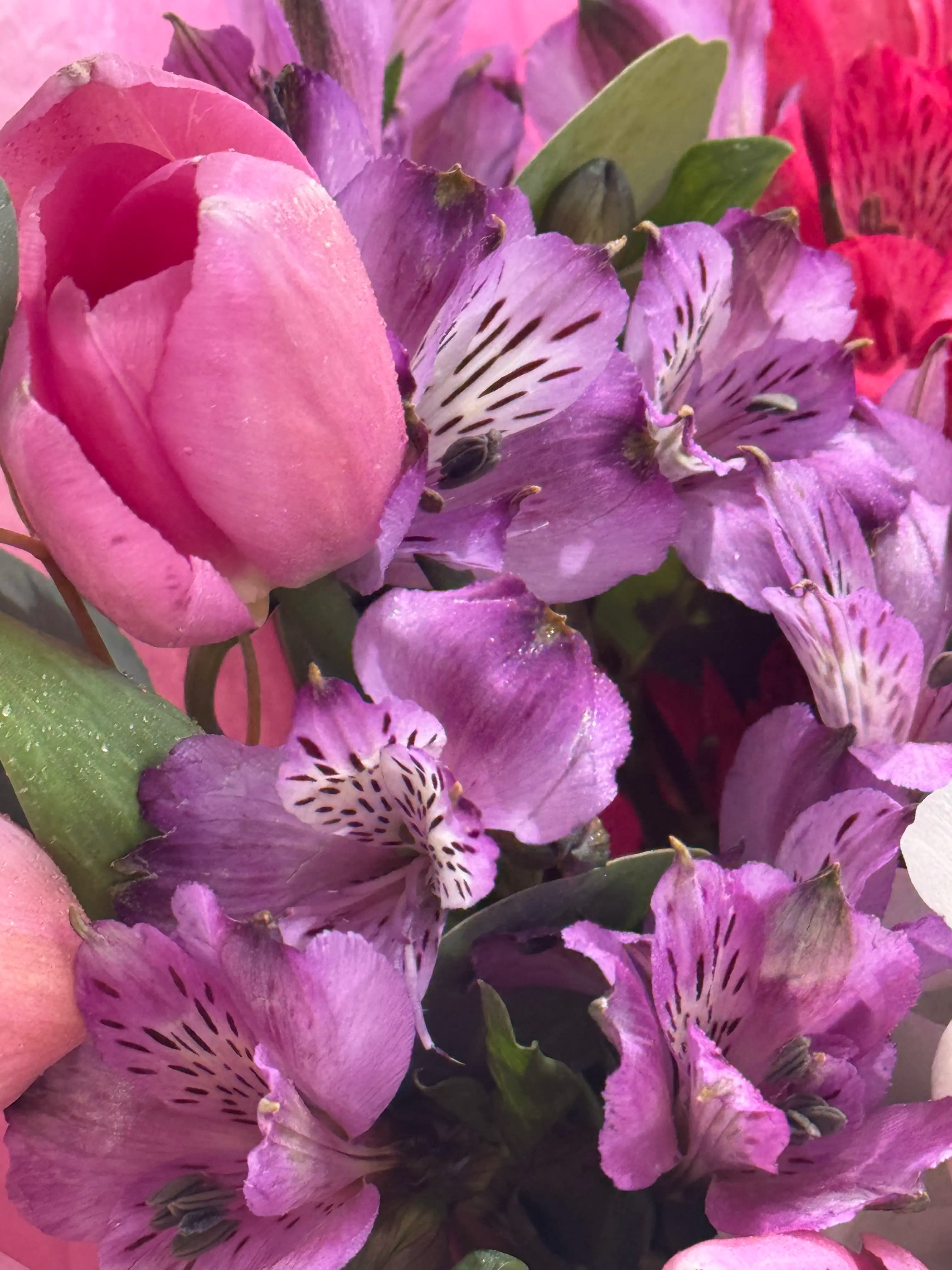 A vibrant hand-tied bouquet blending rich berry tones, soft pinks, and gentle lilac accents. Featuring ranunculus, tulips, alstroemeria, and seasonal blooms wrapped in airy layers and finished with a lavender ribbon, this arrangement feels joyful, romantic, and full of life.