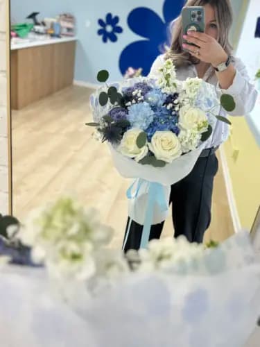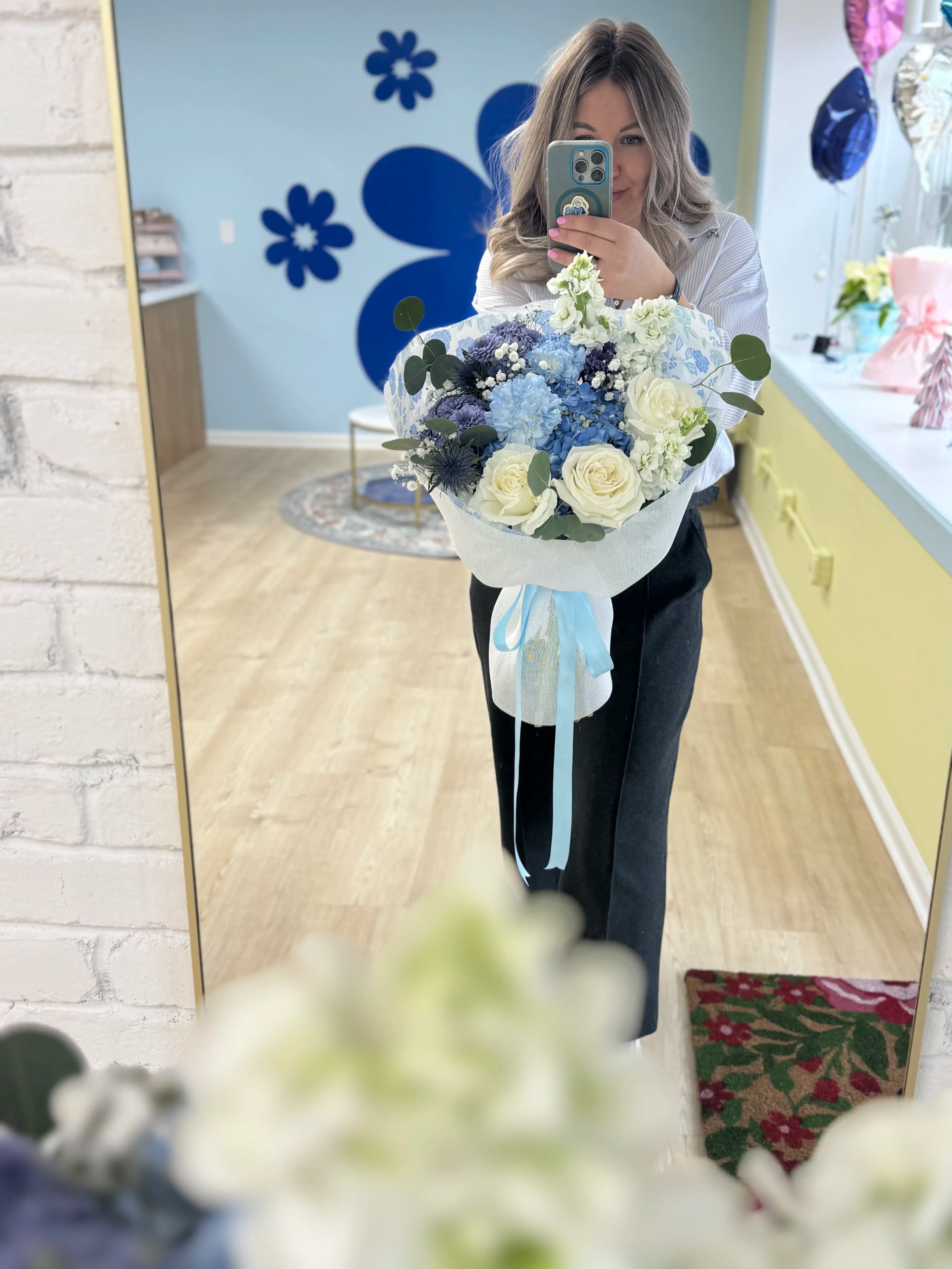 Fresh, airy, and effortlessly elegant — this bouquet blends soft blue hydrangea, creamy white roses, and delicate seasonal blooms, accented with eucalyptus and subtle textures for a calm, refined look. The cool blue palette feels peaceful and modern, while the white florals add timeless elegance.