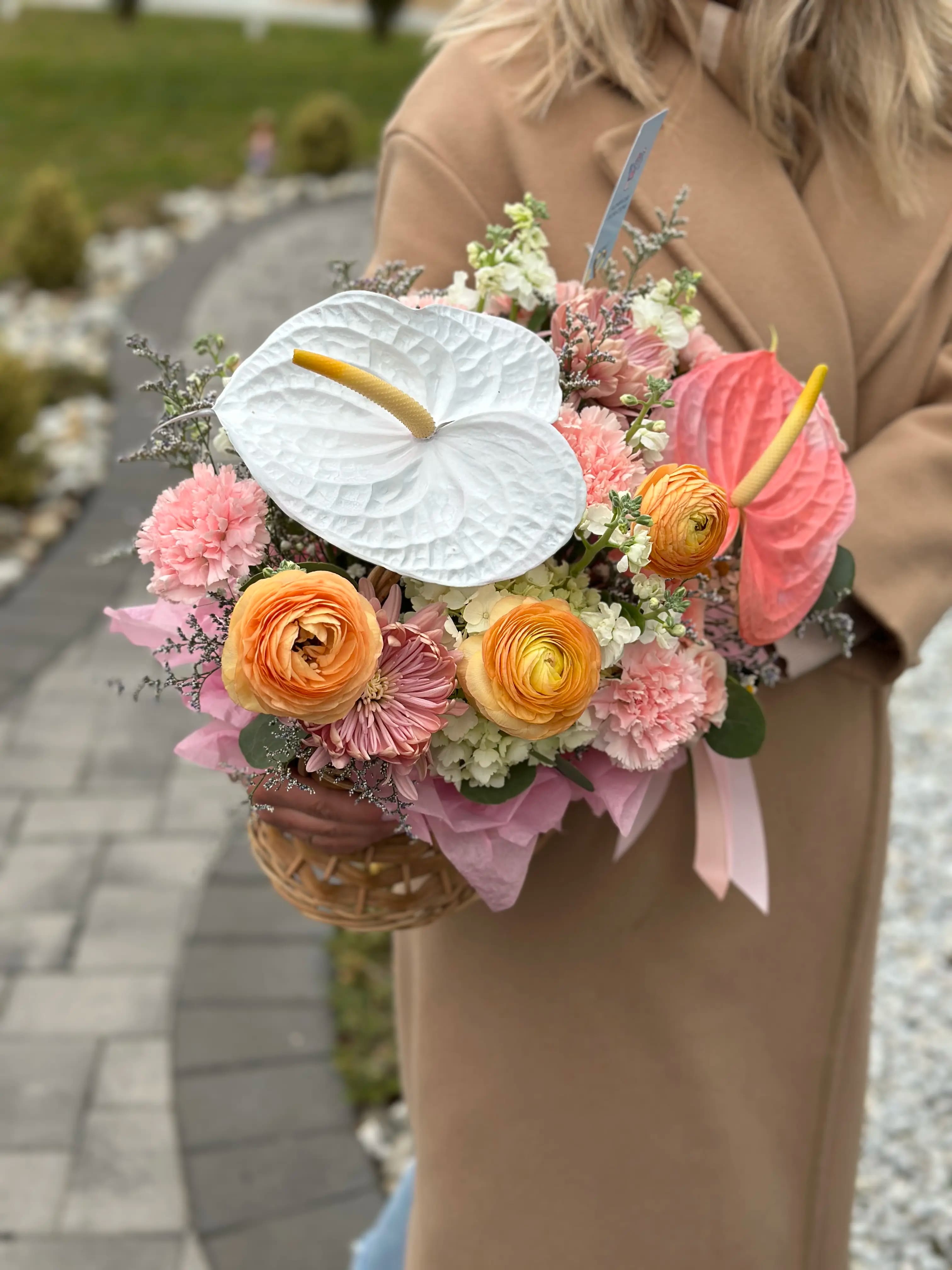 This charming basket features soft pink anthuriums, blush roses, peach ranunculus, pastel carnations, and delicate filler flowers, all accented with fresh greenery and finished with elegant pink wrapping. The woven basket adds a warm, timeless touch, making this arrangement both beautiful and easy to display.