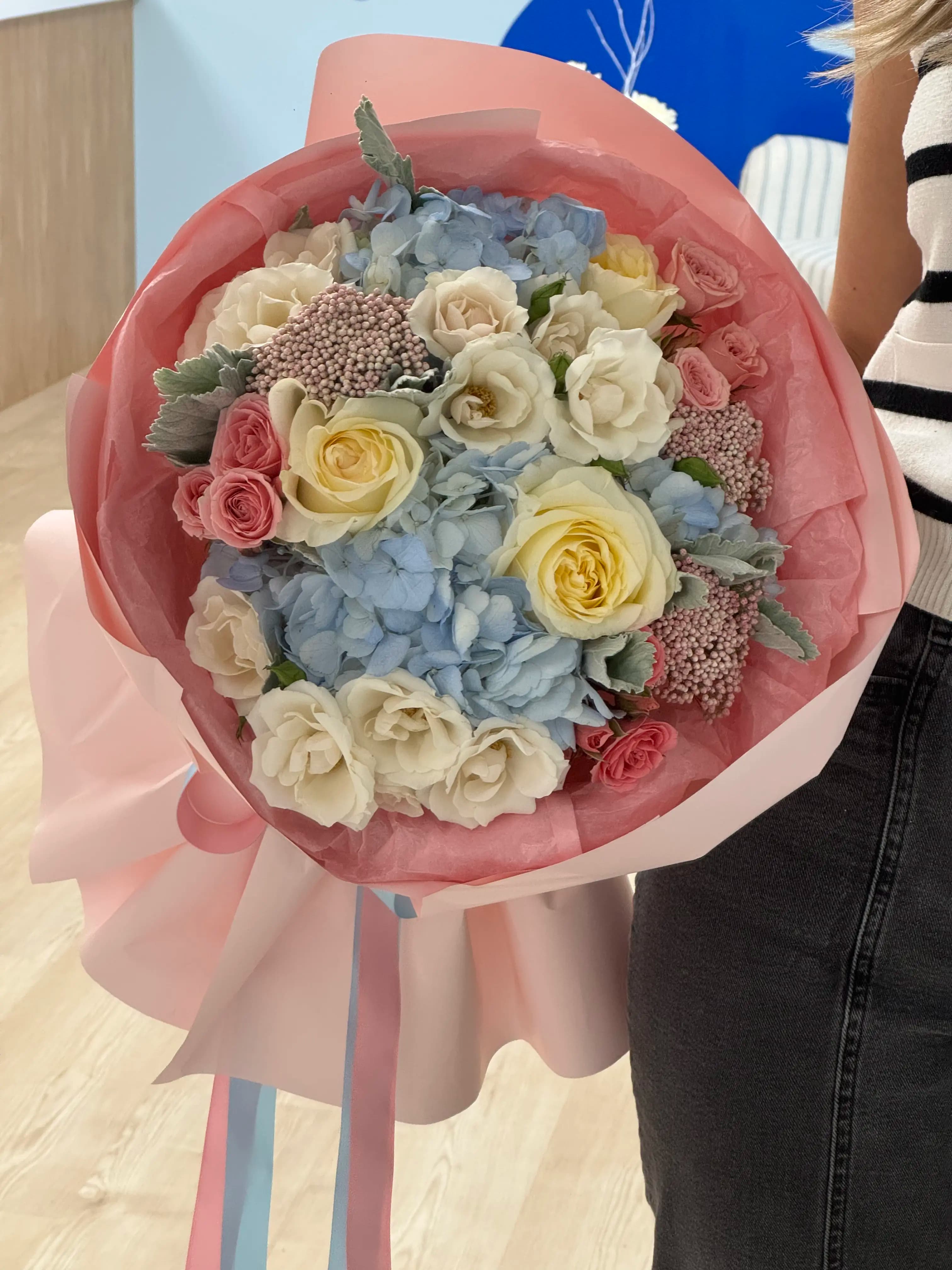 A soft, luxurious bouquet combining airy blue hydrangea, creamy garden roses, delicate blush spray roses, and textured accents, wrapped in layers of pastel pink and finished with flowing blue and blush ribbons. This arrangement feels refined, romantic, and effortlessly graceful.