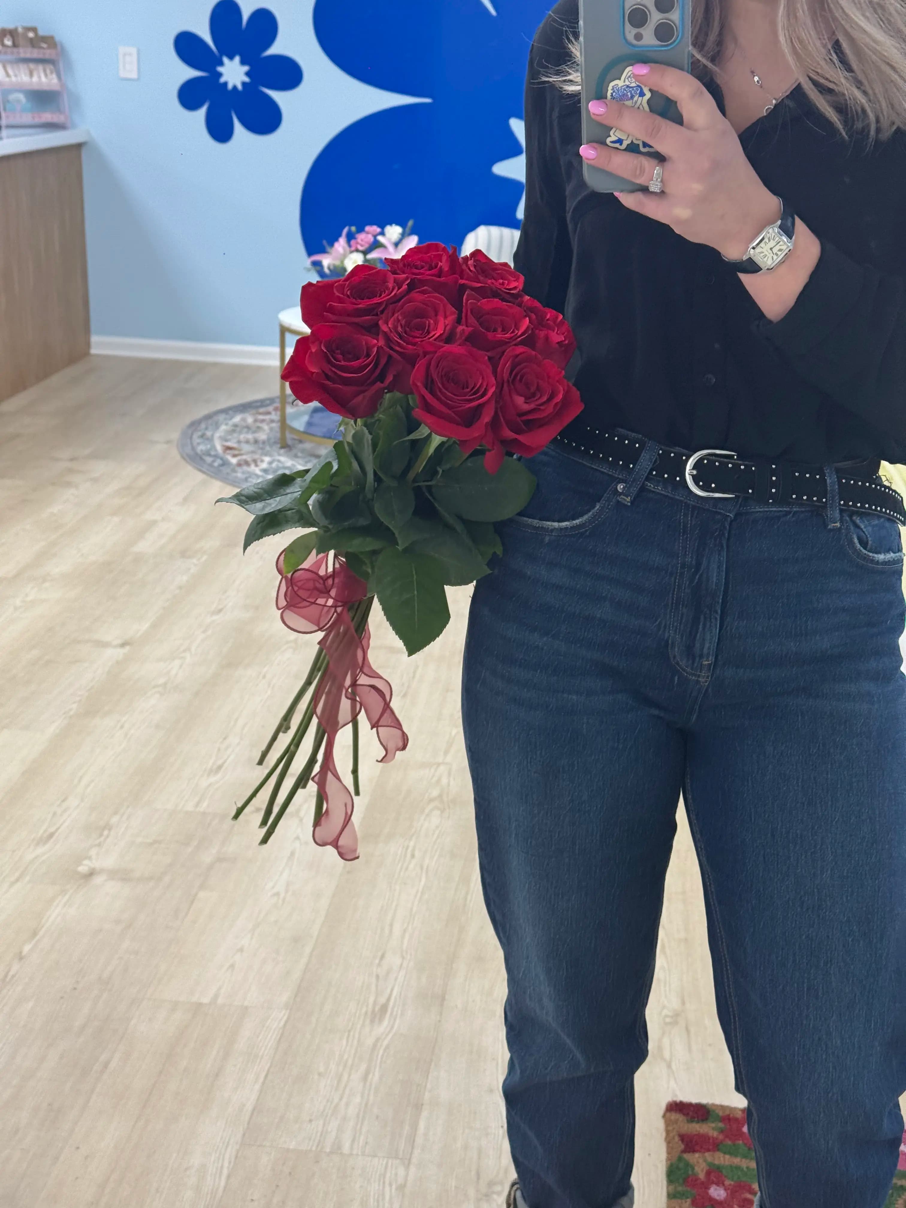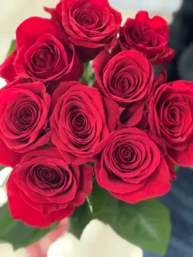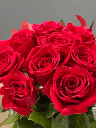 Featuring rich, velvety red roses with lush green foliage, this bouquet speaks for itself — elegant, bold, and unforgettable. Each rose is carefully selected for its color, freshness, and beauty, then hand-arranged to create a clean, refined look.