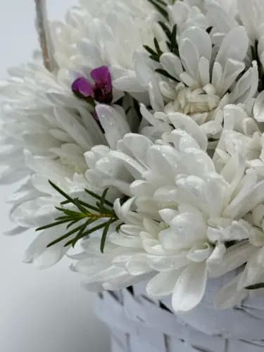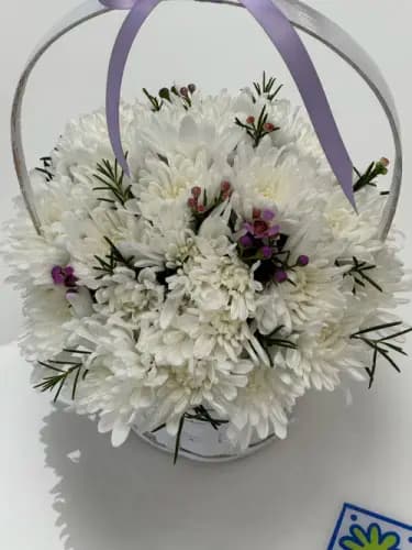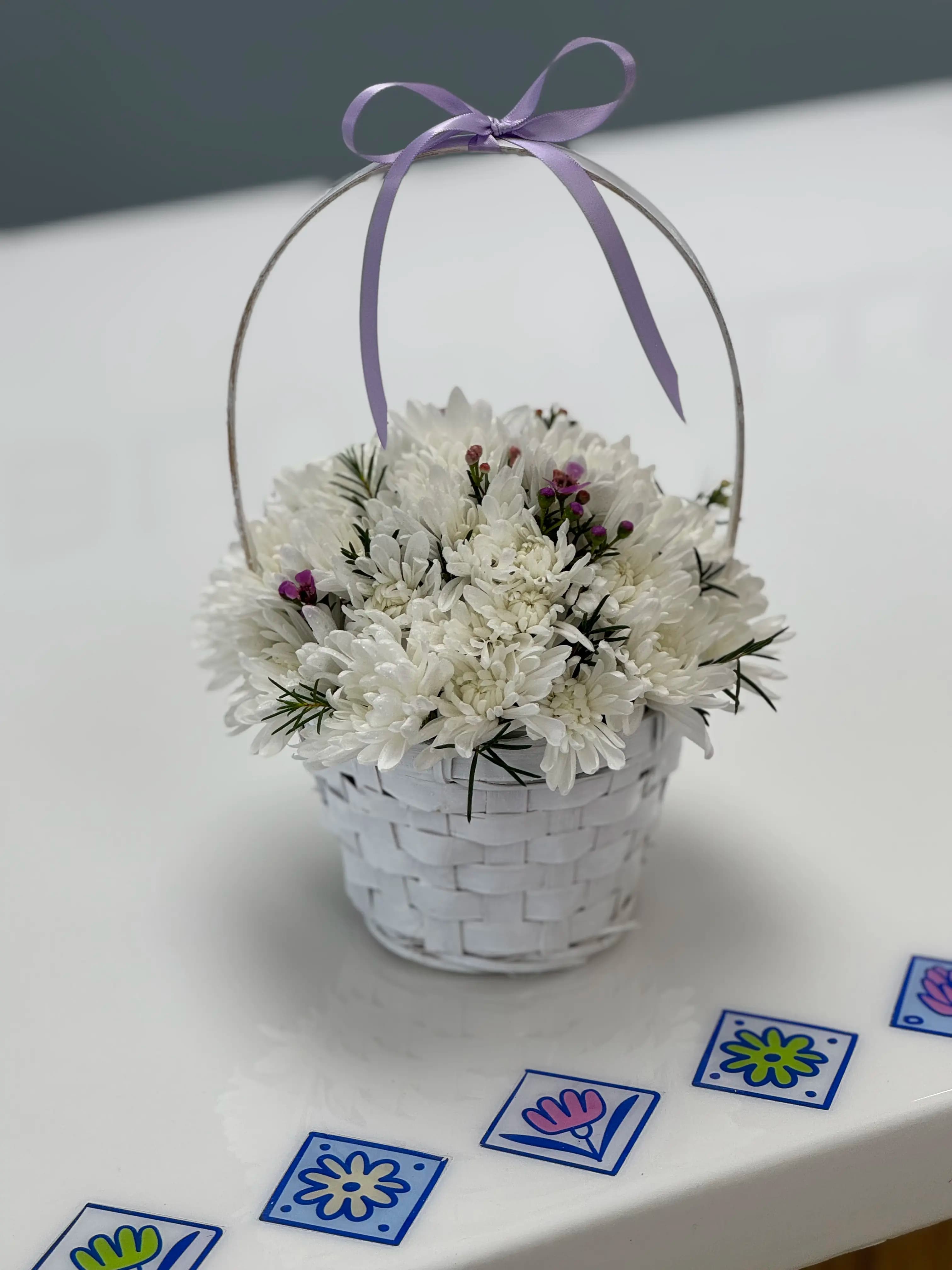 Soft, delicate, and effortlessly charming — this petite basket arrangement features fresh white chrysanthemums, accented with subtle greenery and tiny seasonal blooms. Designed in a classic white woven basket and finished with a lavender ribbon, it brings a calm, gentle elegance to any space.