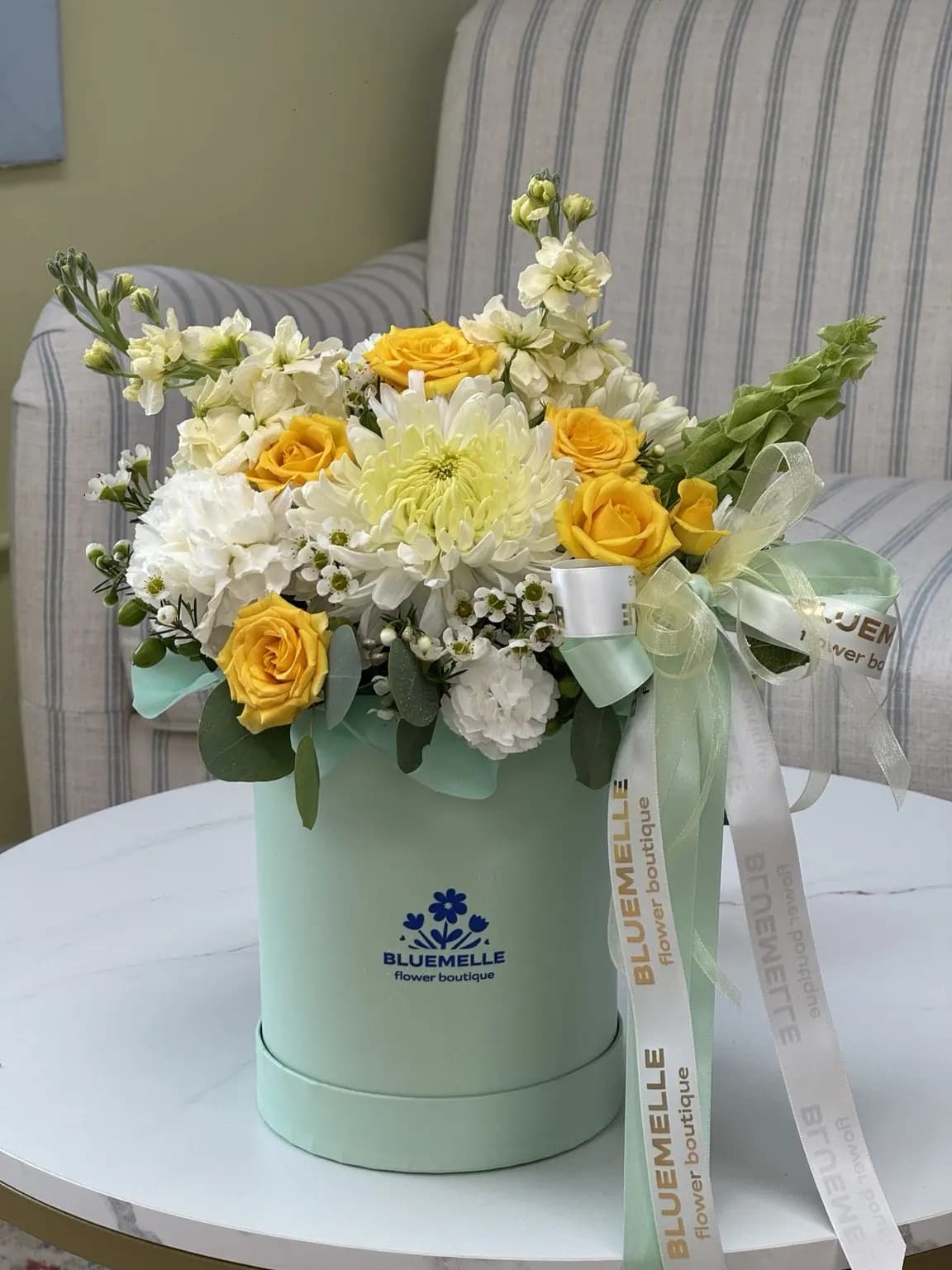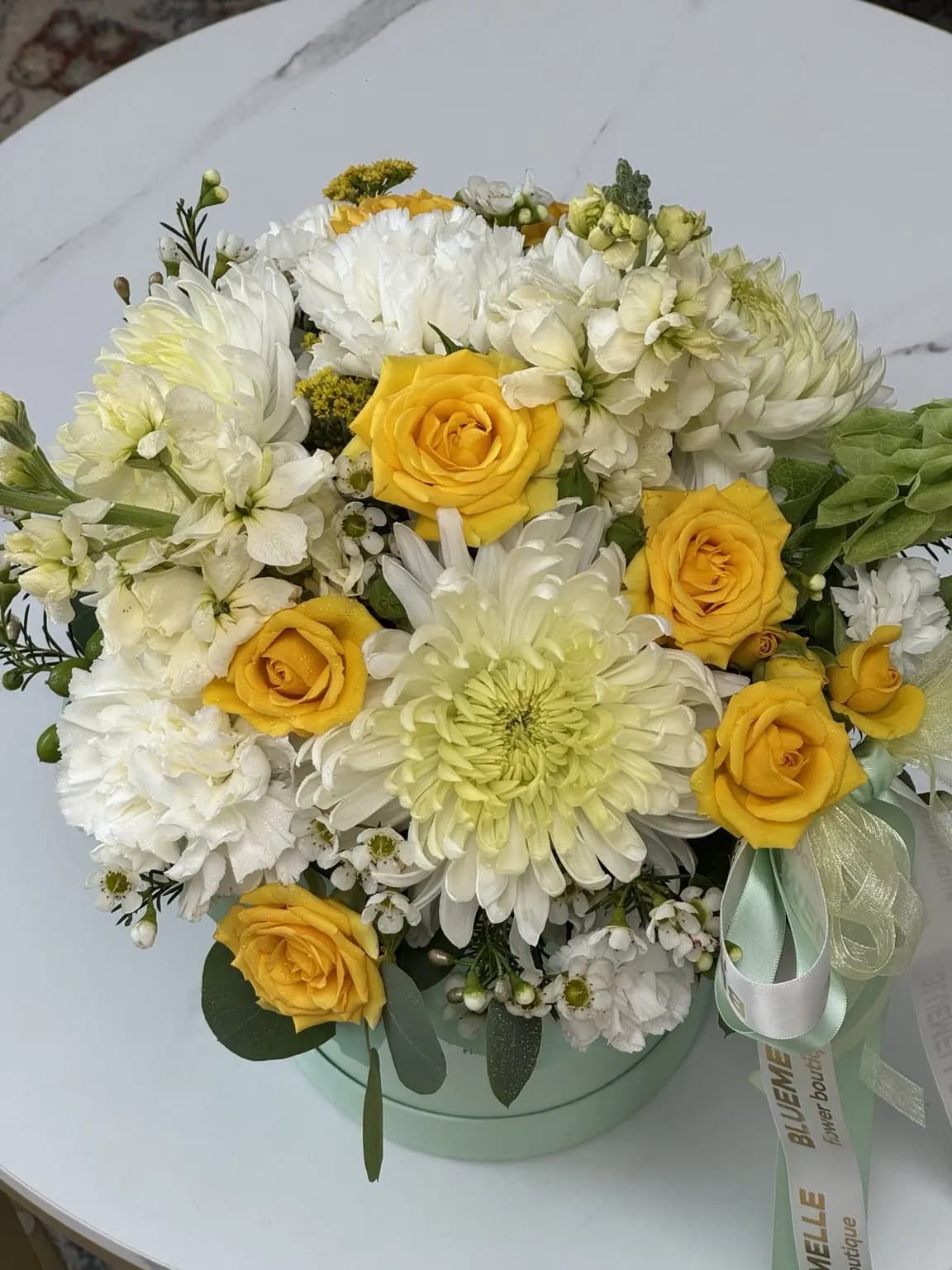 Bright, fresh, and full of life — this cheerful hatbox arrangement blends golden yellow roses, crisp white chrysanthemums, creamy carnations, vibrant green accents, and a striking yellow orchid, all nestled in a refreshing mint-green Bluemelle hatbox.