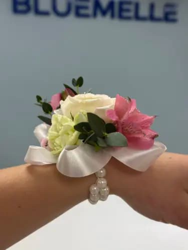 Featuring soft white roses, fresh white blooms, delicate baby’s breath, and natural greenery, this set is designed to complement formal attire with subtle beauty and balance. The corsage is finished with a soft ribbon for comfortable wear, while the boutonniere is crafted to be lightweight and secure.