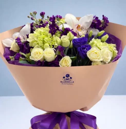 A vibrant and elegant bouquet combining creamy white roses, fresh green hydrangea, rich purple blooms, and delicate white orchids for a striking contrast. Wrapped in soft peach paper and finished with a bold purple ribbon, this arrangement feels joyful, expressive, and refined.