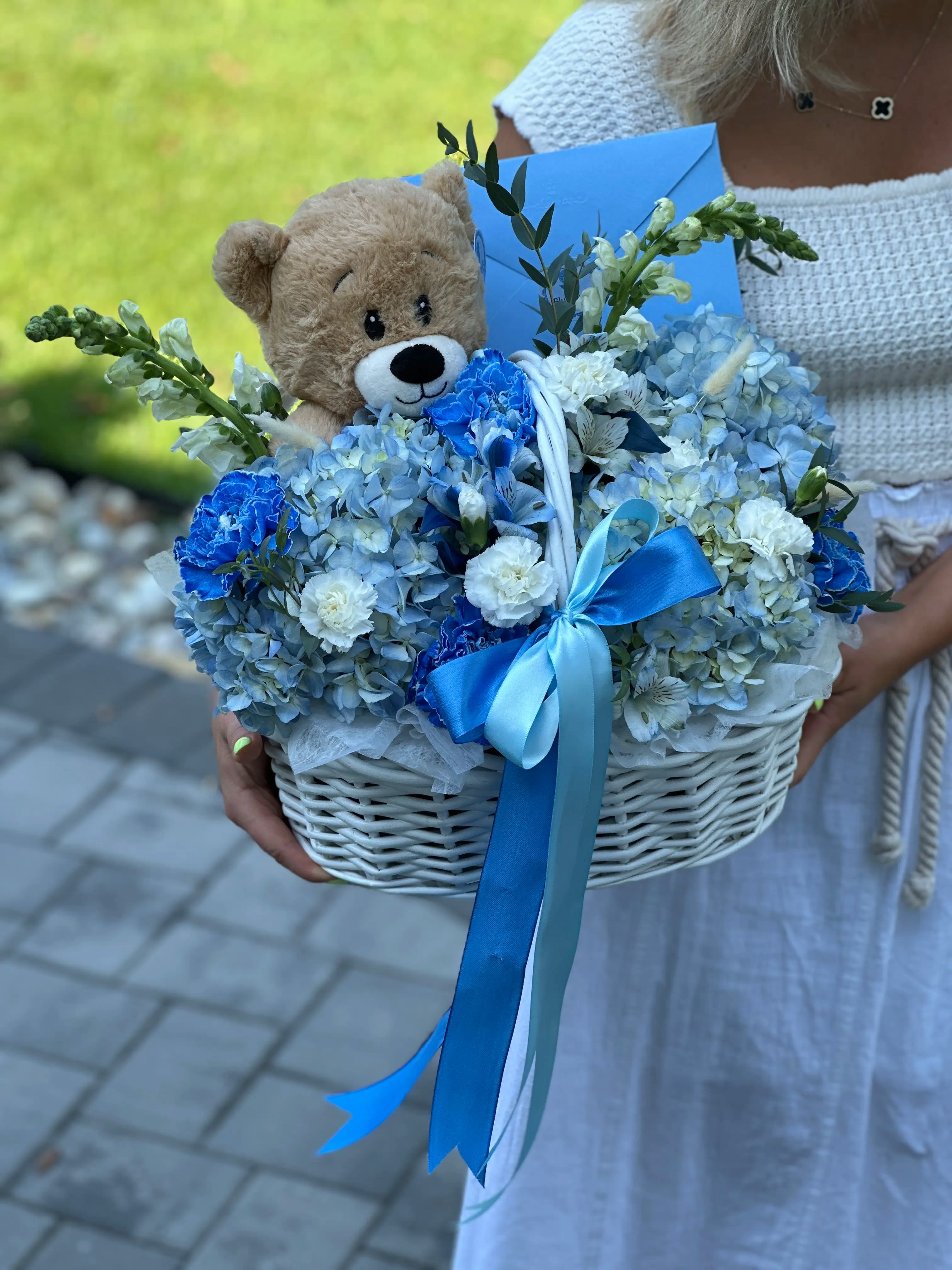 A charming baby-boy themed basket designed with soft blue hydrangeas, white carnations, alstroemeria, and delicate fillers. Nestled inside is an adorable plush teddy bear, adding warmth and sweetness to the arrangement. Styled in a white woven basket and finished with layered blue ribbons, this design is perfect for welcoming a newborn, baby showers, or sending congratulations to growing families.