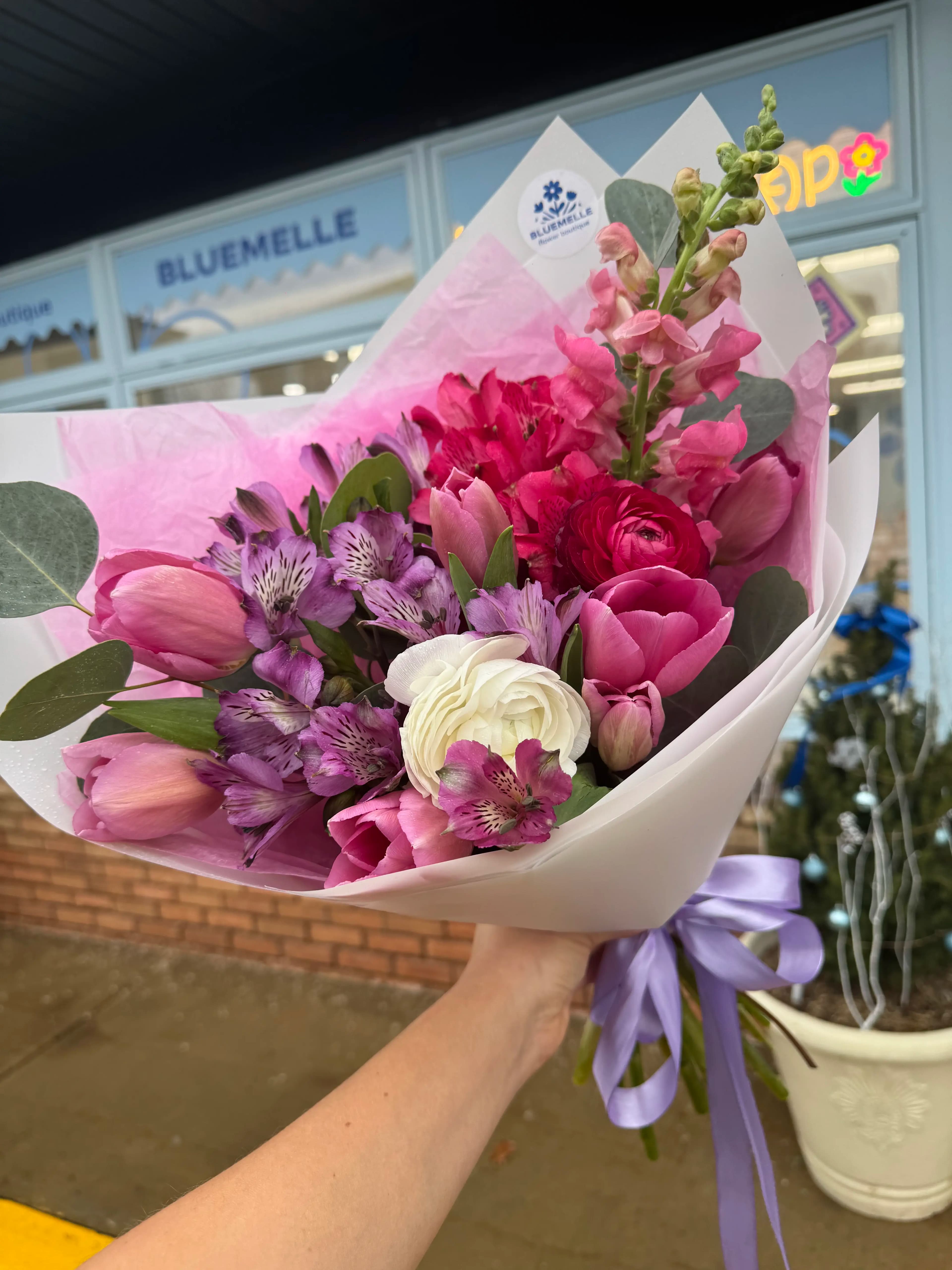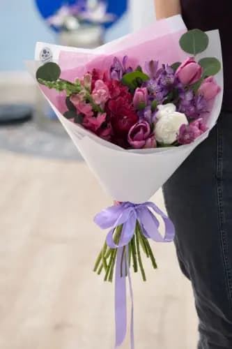 A vibrant hand-tied bouquet blending rich berry tones, soft pinks, and gentle lilac accents. Featuring ranunculus, tulips, alstroemeria, and seasonal blooms wrapped in airy layers and finished with a lavender ribbon, this arrangement feels joyful, romantic, and full of life.