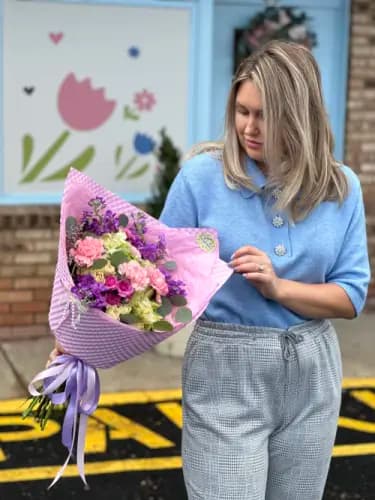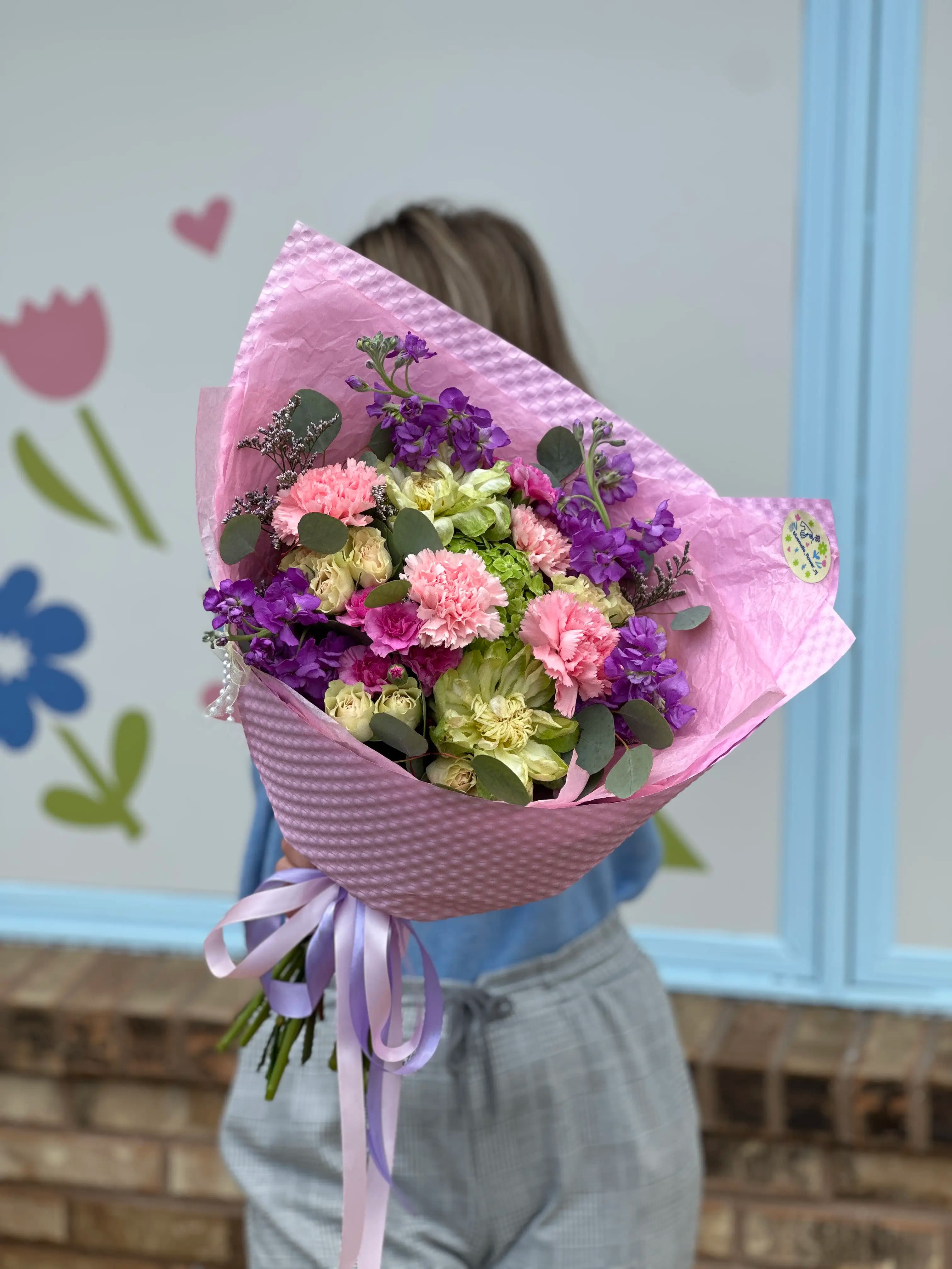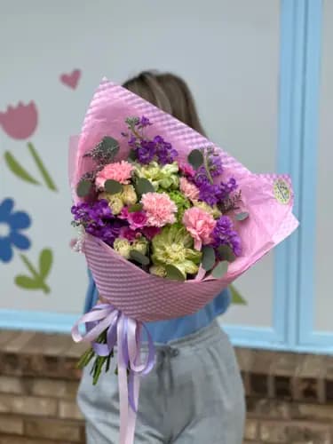 Bright and cheerful bouquet featuring a lively mix of pink carnations, purple stock, soft green roses, and lush eucalyptus. Wrapped in textured lilac paper with a layered pink accent and finished with flowing satin ribbons, this arrangement feels fresh, feminine, and full of color—perfect for birthdays, celebrations, or simply lifting someone’s day.