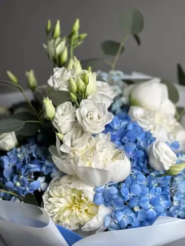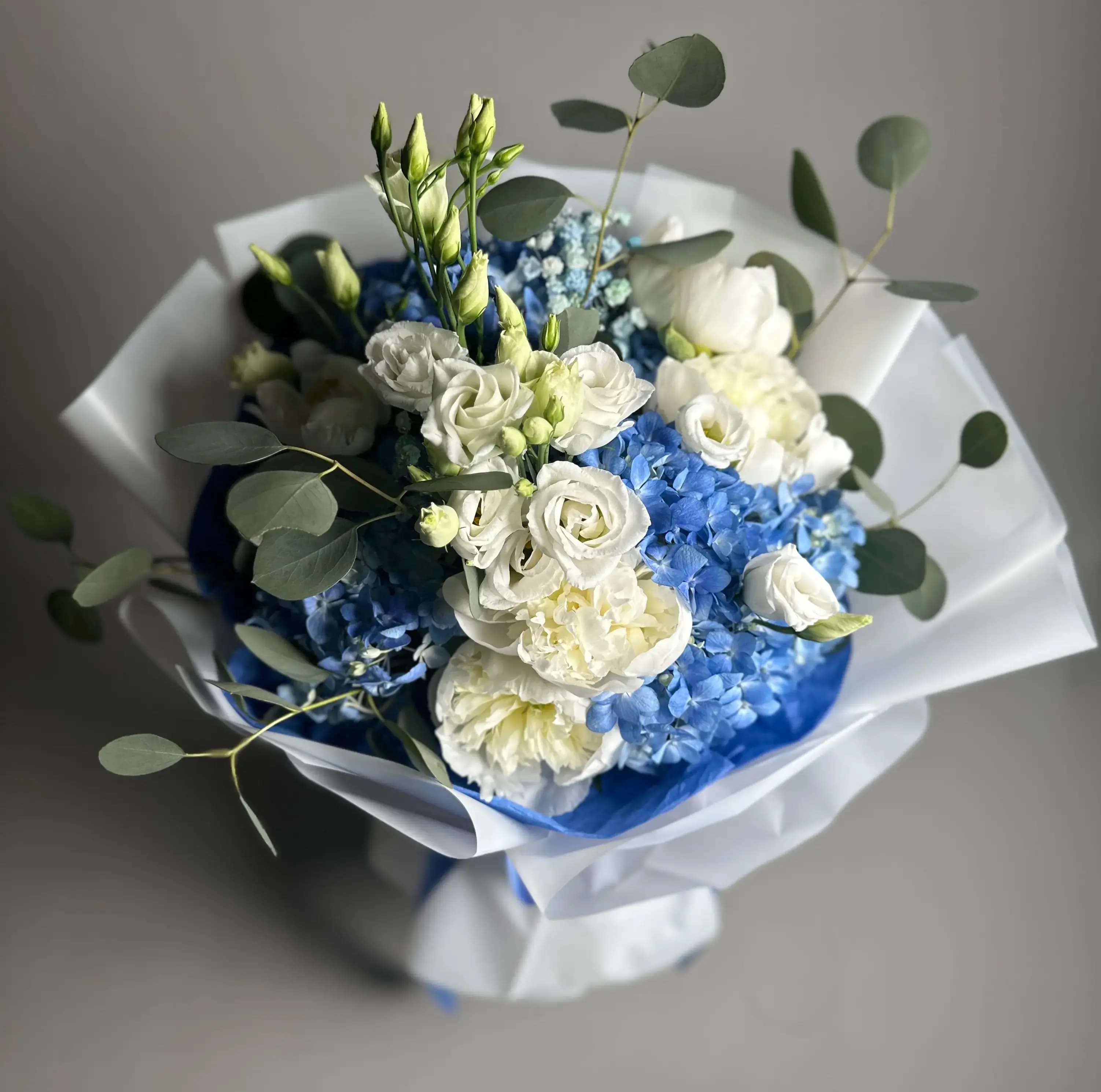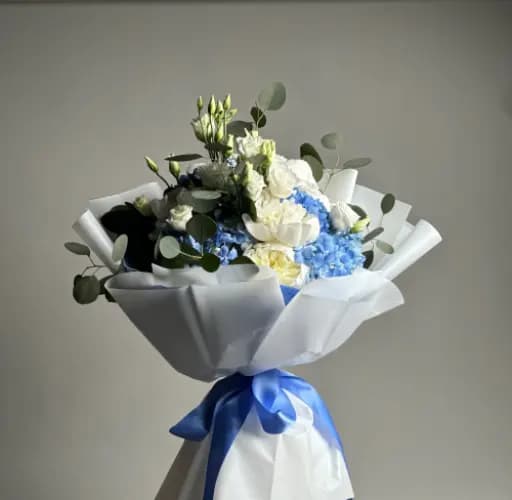 This bouquet features lush blue hydrangea paired with creamy white roses and soft white blooms, accented with fresh eucalyptus greenery. Wrapped in crisp white and blue paper, it offers a clean, sophisticated look that feels both classic and modern.