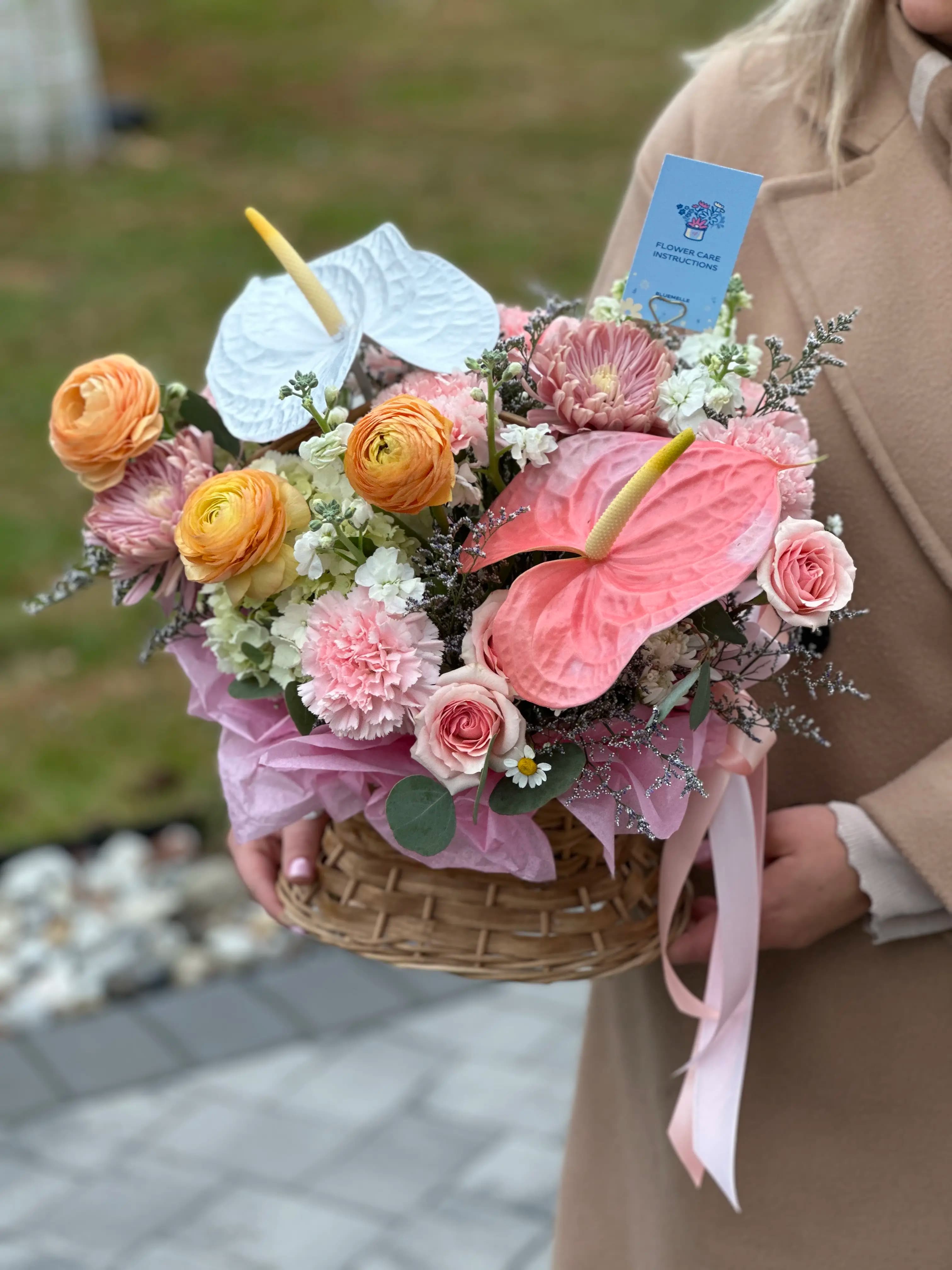 This charming basket features soft pink anthuriums, blush roses, peach ranunculus, pastel carnations, and delicate filler flowers, all accented with fresh greenery and finished with elegant pink wrapping. The woven basket adds a warm, timeless touch, making this arrangement both beautiful and easy to display.