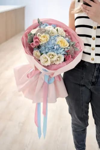 A soft, luxurious bouquet combining airy blue hydrangea, creamy garden roses, delicate blush spray roses, and textured accents, wrapped in layers of pastel pink and finished with flowing blue and blush ribbons. This arrangement feels refined, romantic, and effortlessly graceful.