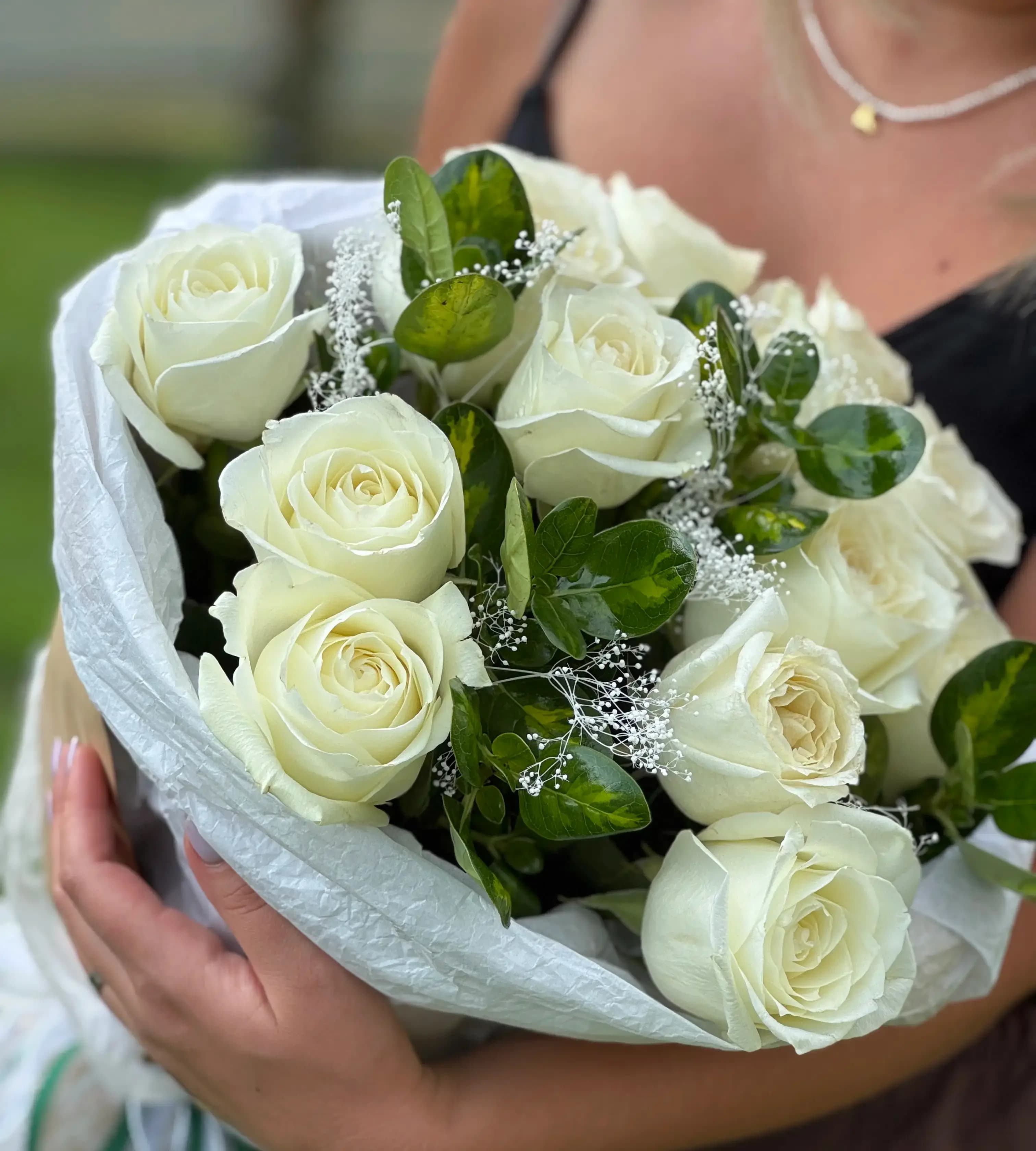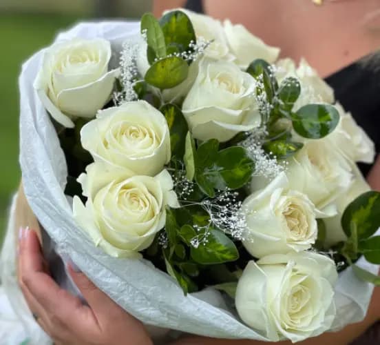 This bouquet features premium ivory roses arranged in a full, elegant shape and accented with delicate white filler and fresh greenery. Wrapped in soft white paper and finished with subtle ribbon details, it offers a clean, sophisticated look that feels calm and classic.