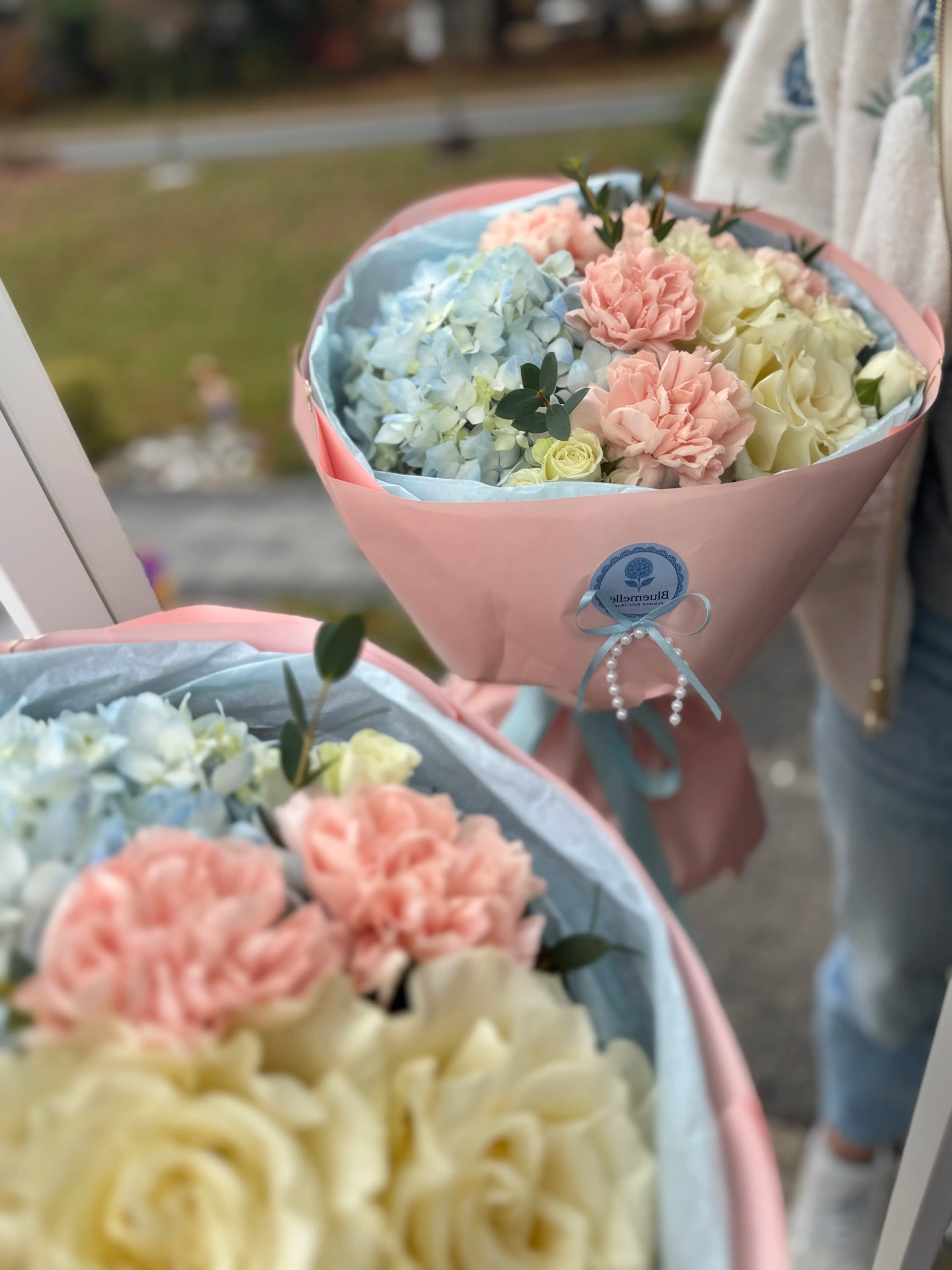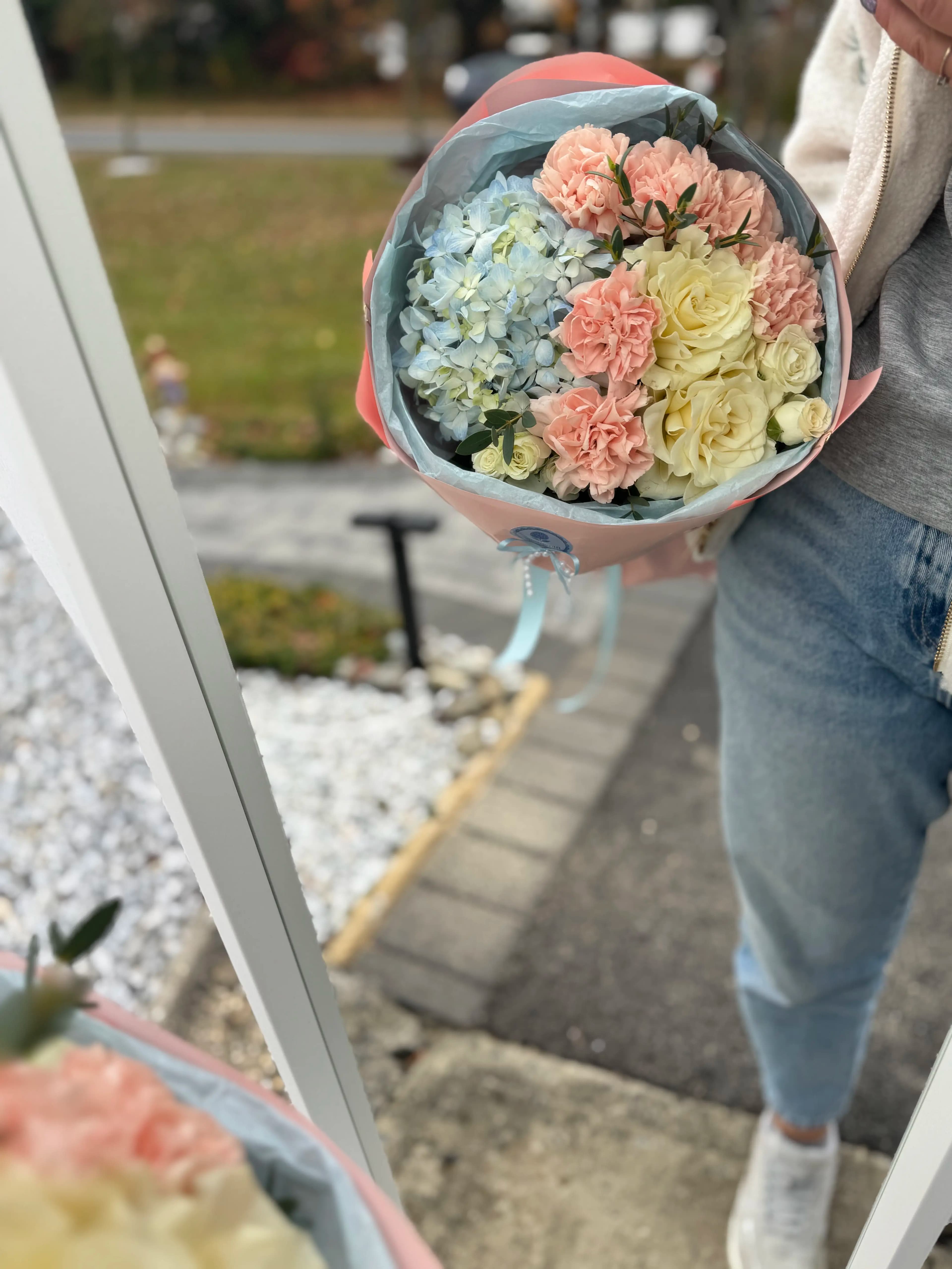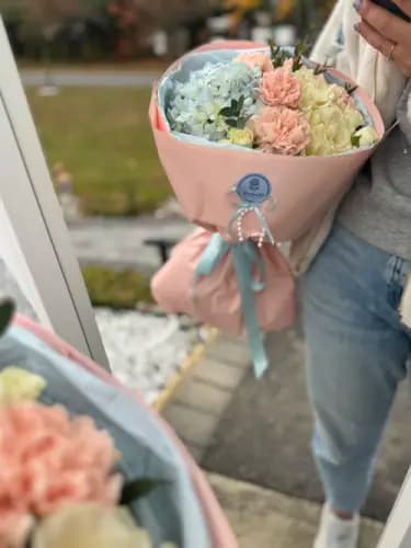 This bouquet features airy blue hydrangea, blush pink carnations, creamy roses, and fresh greenery, beautifully wrapped in soft pink and blue paper and finished with elegant pastel ribbons and subtle decorative accents. The color palette feels light, romantic, and perfectly balanced.