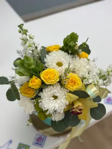 Bright, fresh, and full of life — this cheerful hatbox arrangement blends golden yellow roses, crisp white chrysanthemums, creamy carnations, vibrant green accents, and a striking yellow orchid, all nestled in a refreshing mint-green Bluemelle hatbox.