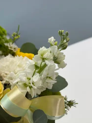 Designed to radiate warmth and optimism, this arrangement feels like a breath of fresh air. Flowing soft yellow ribbonsand natural greenery add movement and balance, creating a look that’s joyful yet refined.